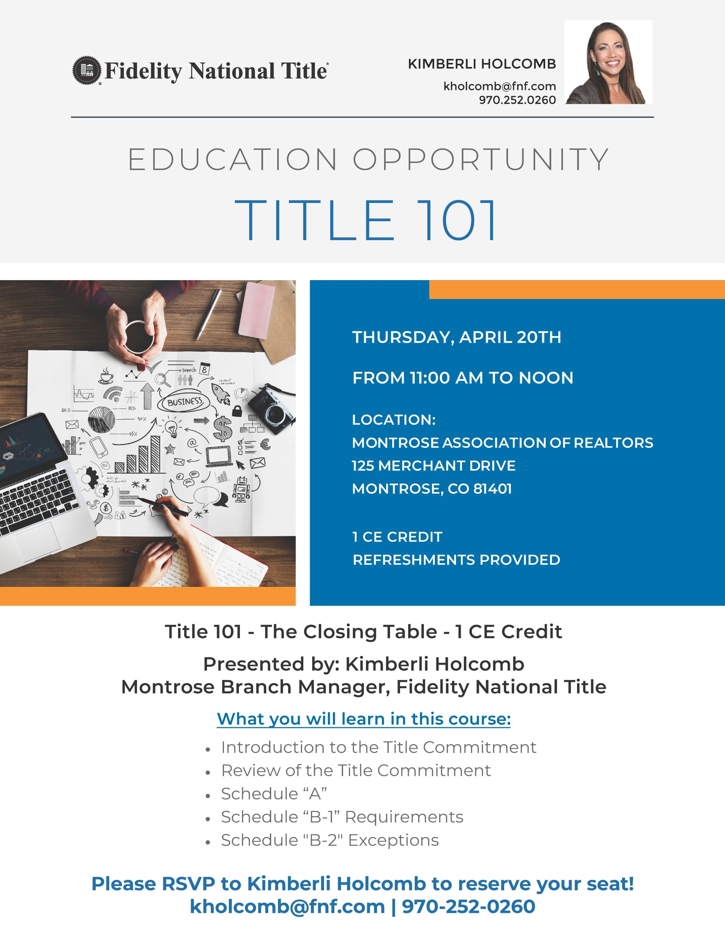 Presented by: Kimberli Holcomb Montrose Branch Manager, Fidelity National Title • Introduction to the Title Commitment • Review of the Title Commitment • Schedule “A” • Schedule “B-1” Requirements • Schedule "B-2" Exceptions. Refreshments provided